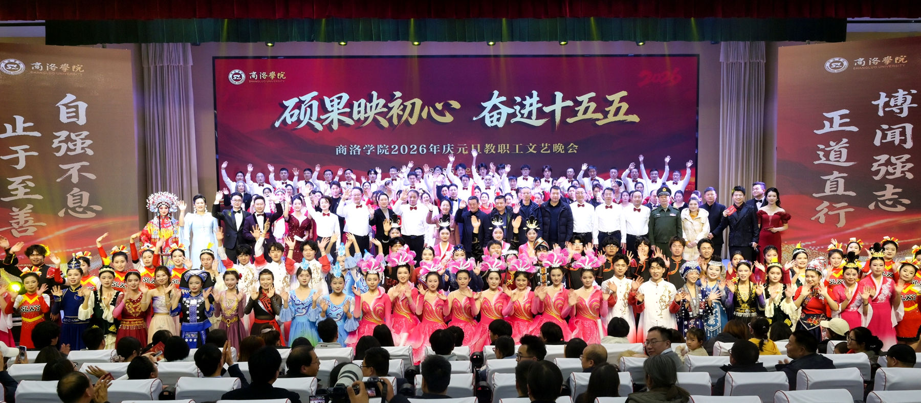弦歌不輟映初心,盛世華章啟新篇。在元旦佳節(jié)即將到來之際,12月26日晚,學(xué)校舉辦“碩果映初心 奮進十五五”慶元旦教職工文藝晚會。校長權(quán)雅寧出席晚會并致辭。全體校領(lǐng)導(dǎo),地方黨委、政府相關(guān)部門及合作企事業(yè)單位負責(zé)人,商洛學(xué)院附屬小學(xué)、附屬幼兒園等單位嘉賓與500余名教職工代表歡聚一堂,共同觀看晚會。晚會在大學(xué)生藝術(shù)團青春律動的開場舞《和合之韻·盛世迎新》中拉開帷幕。第一篇章“碩果盈枝·憶來路”,用歌舞和朗誦...