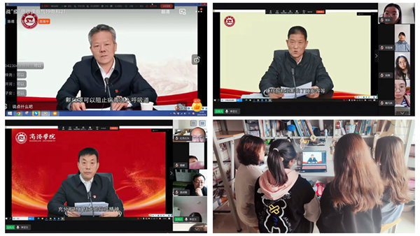 為進(jìn)一步鞏固疫情防控工作成果,弘揚(yáng)偉大抗疫精神,提振師生戰(zhàn)“疫”必勝的信心和決心,4月16日,我校組織開展萬(wàn)名師生同上一堂戰(zhàn)“疫”專題思政課活動(dòng)。各二級(jí)學(xué)院黨委、黨總支通過(guò)釘釘平臺(tái)搭建線上課堂,校領(lǐng)導(dǎo)張志昌、范新會(huì)、彭虎軍以及醫(yī)務(wù)室負(fù)責(zé)人任秀梅通過(guò)“云端交流”的方式,為全校萬(wàn)余名師生解讀疫情防控政策,宣講防疫知識(shí),分析戰(zhàn)“疫”斗爭(zhēng)中彰顯出的中國(guó)共產(chǎn)黨領(lǐng)導(dǎo)和中國(guó)特色社會(huì)主義制度的顯著優(yōu)勢(shì),引導(dǎo)廣大青...