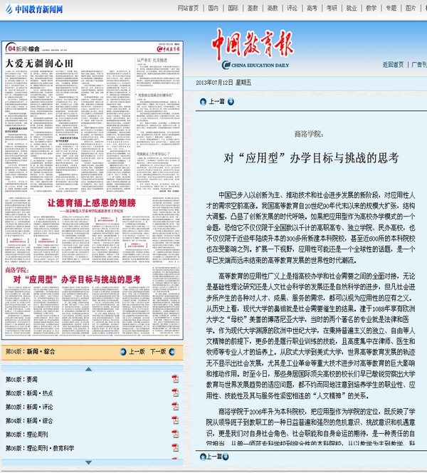 自2006年升本以來,我校著力圍繞發(fā)展、把握大局,適應社會發(fā)展趨勢和對人才的需求,立足高等教育發(fā)展實際和自身定位,制定了建成特色鮮明、多學科協調發(fā)展的應用型本科院校的辦學定位。7月12日,《中國教育報》刊登校黨委副書記左曉民署名文章《商洛學院:對“應用型”辦學目標與挑戰(zhàn)的思考》,介紹了我校應用型的辦學定位與目標,從辦學理念、辦學體系、制度創(chuàng)新等方面闡述了對建設應用型本科高校的思考。