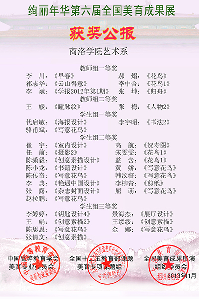 其中,藝術系被評為“全國藝術美育先進單位”、“藝術美育教學成果二等獎”、“藝術美育教學模范系”。藝術系3名教師獲得藝術美育個人教學成果一等獎。藝術系李中合教授等的作品獲得特等獎2項、一等獎9項、二等獎2項;學生代啟敏等的作品獲得一等獎3項、二等獎15項、三等獎7項。同時,12名師生的作品入選2014故宮太廟全國高校教師(大學生)優(yōu)秀藝術作品展。