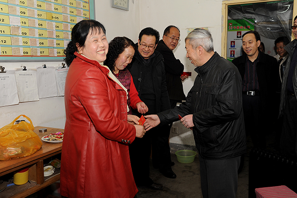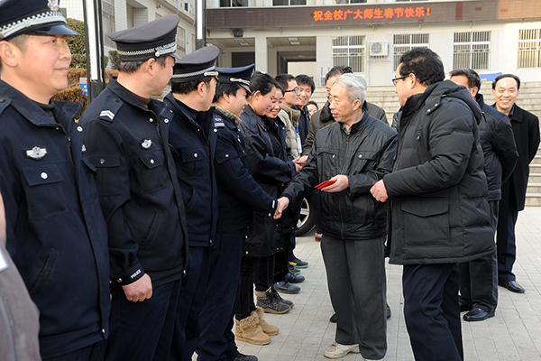 在學院辦公室、保衛(wèi)處、后勤保障處負責人的陪同下,左曉民、魏書堂一行先后前往各處門衛(wèi)、教學樓、公寓、圖書館、體育場值班室,后勤保障處公寓服務(wù)中心、水電班,保衛(wèi)處警務(wù)室、監(jiān)控室等一線崗位,與工作人員親切握手,代表學校黨政向大家拜年,對堅守在工作崗位上的工作人員表示感謝,并親手送上節(jié)日慰問品。在每一個慰問地點,校領(lǐng)導都詳細詢問了各部門的工作情況,要求每位工作人員在春節(jié)期間一定要把安全穩(wěn)定放在首位,保證全校師生度過一個溫暖、祥和的春節(jié)。