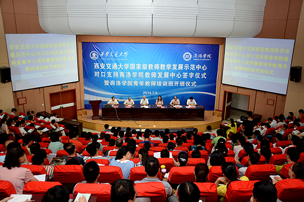 為加強(qiáng)我校青年教師隊(duì)伍建設(shè),造就一支德才兼?zhèn)?、教學(xué)科研能力強(qiáng)的骨干隊(duì)伍,培養(yǎng)一批學(xué)術(shù)思想活躍、創(chuàng)新能力強(qiáng)、富有奉獻(xiàn)精神的拔尖人才,7月5日,西安交通大學(xué)國(guó)家級(jí)教師教學(xué)發(fā)展示范中心與我校教師教學(xué)發(fā)展中心簽訂對(duì)口支持合作協(xié)議,并對(duì)我校89名青年教師進(jìn)行了為期兩天的教學(xué)培訓(xùn)。陜西省教育廳教師工作處副處長(zhǎng)樊婧,西安交通大學(xué)國(guó)家級(jí)教師教學(xué)發(fā)展示范中心主任馬知恩、副主任鮑崇高,校長(zhǎng)劉建林、校黨委副書記左曉民出席簽字儀式。這是西安交通大學(xué)首次與兄弟高校簽訂合作協(xié)議,對(duì)外開(kāi)展教師教學(xué)培訓(xùn)工作,同時(shí)也標(biāo)志著我校2014年青年教師培訓(xùn)班正式開(kāi)班。