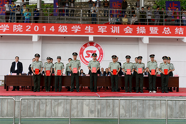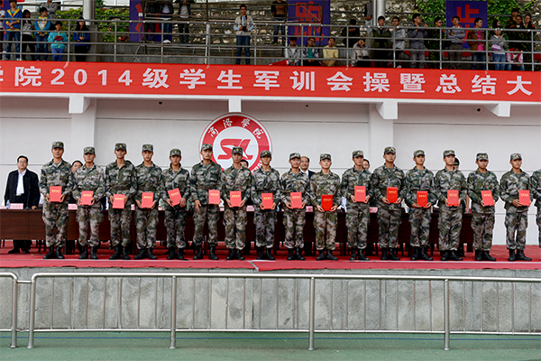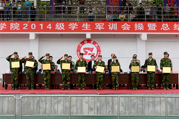 軍訓(xùn)匯報表演結(jié)束后,石啟英宣讀了2014級軍訓(xùn)工作先進(jìn)集體及個人的表彰決定。主席臺上的領(lǐng)導(dǎo)和嘉賓為軍訓(xùn)隊(duì)列先進(jìn)集體、軍訓(xùn)內(nèi)務(wù)先進(jìn)集體、軍訓(xùn)優(yōu)秀教官、軍訓(xùn)工作先進(jìn)個人及參訓(xùn)優(yōu)勝標(biāo)兵代表頒發(fā)了獎牌和證書。