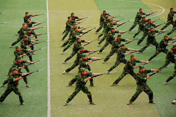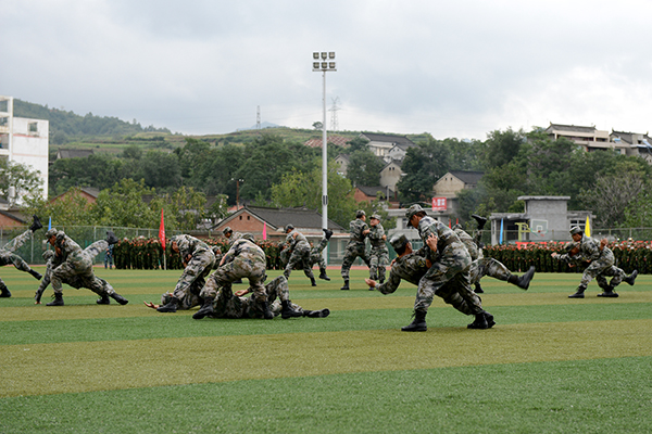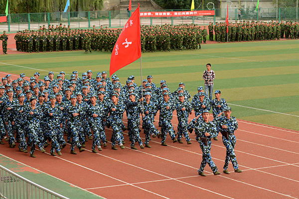 伴隨著著激昂奮進(jìn)的《檢閱進(jìn)行曲》,校長劉建林檢閱了軍訓(xùn)團(tuán)全體學(xué)生。軍訓(xùn)團(tuán)各連組成24個受閱方陣,以嚴(yán)整的軍容軍姿依次通過主席臺。同學(xué)們口號嘹亮、動作整齊、步伐穩(wěn)健、英姿颯爽,充分展現(xiàn)了我校學(xué)生的精神風(fēng)貌。今年的分列式增加了持槍方陣、刺刀方陣、衛(wèi)生兵方陣和海軍方陣,具有更強(qiáng)的視覺效果和沖擊力。分列式結(jié)束后,我校學(xué)生進(jìn)行了刺殺操、花樣隊(duì)列和軍體拳匯報表演。男子刺殺操動作整齊利落、殺氣騰騰,展示了壓倒一切敵人的英雄氣概;由600人表演的軍體拳節(jié)奏分明、套路連貫、氣勢磅礴、喊殺聲震天,贏得了現(xiàn)場陣陣熱烈的掌聲。軍訓(xùn)教官也進(jìn)行了精彩的單兵班排戰(zhàn)術(shù)和擒敵拳表演,將大會氣氛推向了高潮。