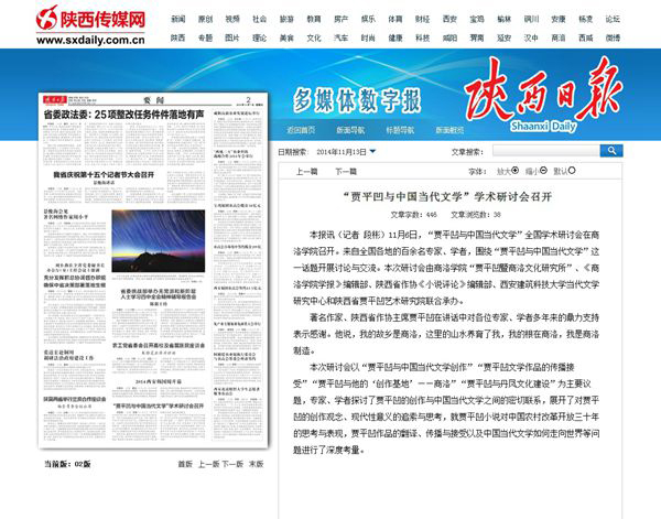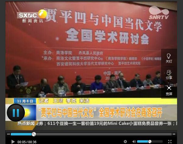 陜西廣播電視臺(tái):11月8日陜西一套《第一新聞(午間播報(bào))》欄目http://www.snrtv.com/content/2014-11/08/content_11808462.htm#(點(diǎn)擊該網(wǎng)絡(luò)鏈接,查找該頁(yè)面下方第13個(gè)新聞視頻《“賈平凹與中國(guó)當(dāng)代文化”全國(guó)學(xué)術(shù)研討會(huì)在商洛召開(kāi)》)