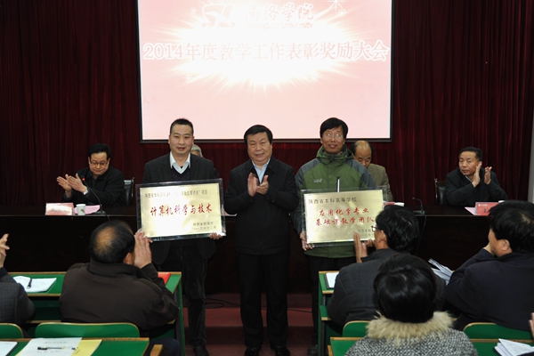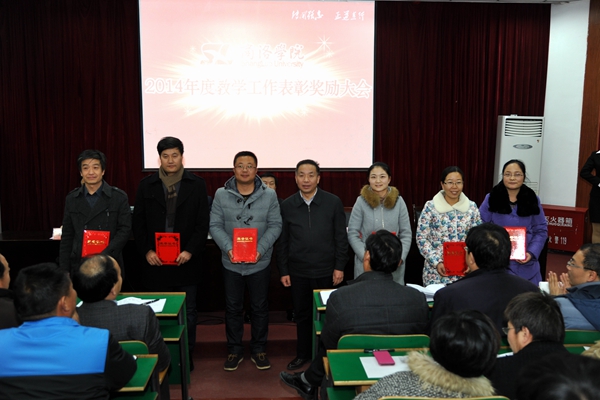 在熱烈的掌聲中,黨委書記張景書為省級本科教學(xué)工程項目授牌,校長劉建林、黨委副書記左曉民、紀委書記王思懷分別為2014年度教學(xué)技能競賽優(yōu)勝者、校級本科教學(xué)工程精品課程、校級教學(xué)名師、校級雙語教學(xué)示范課程、優(yōu)秀實習(xí)帶隊教師、優(yōu)秀教案及優(yōu)秀電子課件獲獎?wù)哳C發(fā)榮譽證書。左曉民宣讀了表彰決定。
