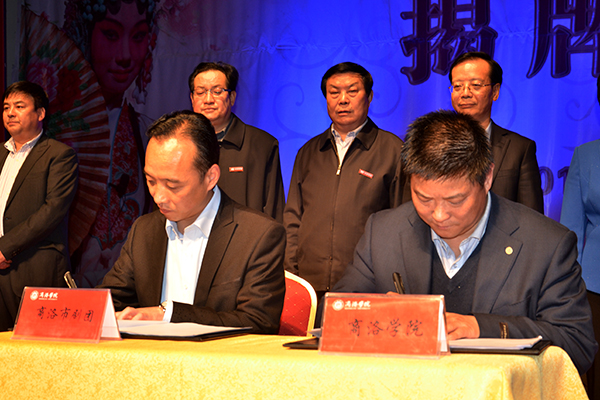 3月31日晚,由我校與商洛市劇團聯(lián)合成立的商洛學(xué)院戲曲學(xué)院揭牌儀式在市劇團小劇場隆重舉行。我校80屆校友、陜西省政府副秘書長、省政府機關(guān)事務(wù)局局長孟軍,商洛市政府副市長劉榮賢出席揭牌儀式,共同見證這一校地合作的盛事。我校黨委書記張景書、商洛市文廣新局局長周云岳為戲曲學(xué)院揭牌,我校副校長范新會、商洛市劇團團長李小斌簽署聯(lián)合成立商洛學(xué)院戲曲學(xué)院協(xié)議書,商洛市文廣新局局長周云岳代表鑒證方在協(xié)議書上簽字。揭牌儀式由校紀(jì)委書記王思懷主持。