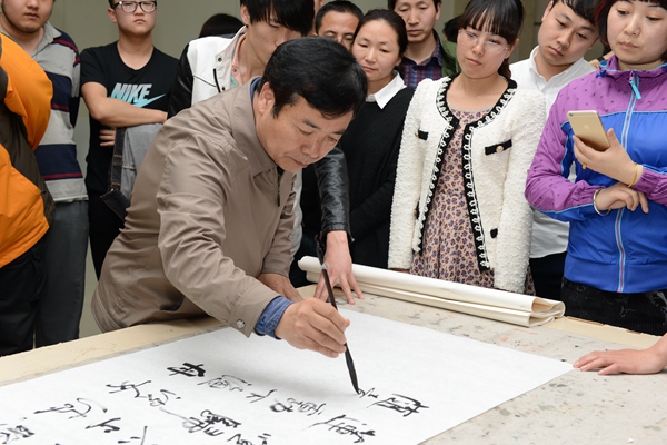 在我校師生的邀請(qǐng)下,王安泉教授在現(xiàn)場(chǎng)揮毫指導(dǎo),親自示范,傳授書(shū)法寫(xiě)作的技巧。王教授行筆不激不厲、揮灑自如、氣度非凡,贏得了大家的一致好評(píng)。