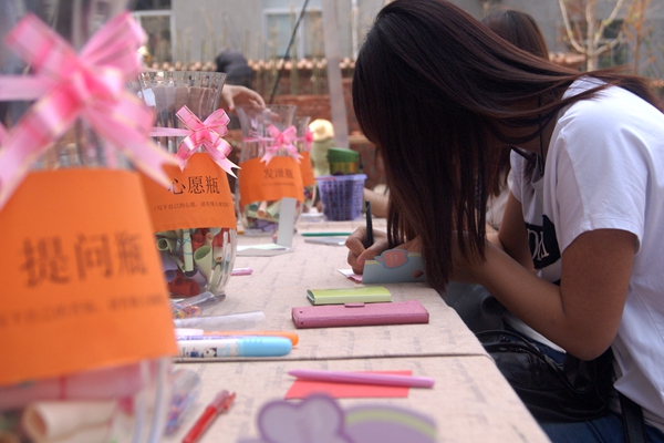 人文學院組織的“傳遞正能量,將愛進行到底”漂流瓶活動在我校學生中引起了廣泛關(guān)注。參與活動的同學寫下了寄托祝愿的心愿瓶、訴說惱煩的提問瓶、分享感動的溫暖瓶,由其他同學來幫助他們實現(xiàn)心愿,解答疑問,一起分享愛的感動。同學們在活動中通過一句句溫暖、為善、感恩的話,化解生活中人事沖突,釋放因?qū)W習、工作、人際等帶來的壓力與負性情緒,學會表達、學會尊重、學會關(guān)心他人。在快樂中釋放了壓力,在溫暖中傳遞著正能量?;顒庸灿嬍盏礁黝愖8!⑿脑缚ㄆ?10余個,達成各類提問和心愿180余個,參與人次達到400余人。