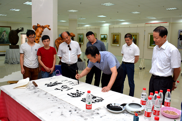 肖玉龍一行考察了我校辦學成就展廳、陜西省尾礦資源綜合利用重點實驗室、秦嶺植物標本陳列室商洛文化暨賈平凹研究中心、商洛紅色文化資料館、藝術(shù)展廳等處。在藝術(shù)展廳,陜西省外經(jīng)貿(mào)實業(yè)集團副總經(jīng)理呂軍政還揮毫潑墨,為藝術(shù)學院題字《藝海無疆》。