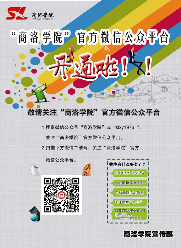 為適應新媒體時代的形勢發(fā)展需要,拓展我校宣傳工作,更好地服務師生、宣傳校園文化,近日,我校正式開通了官方微信公眾平臺“商洛學院”,微信號為slxy1976。