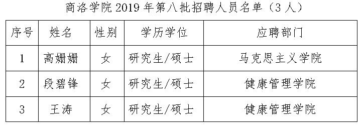 根據(jù)陜西省人社廳《關(guān)于陜西省事業(yè)單位公開招聘人員辦法》規(guī)定及《商洛學院2019年人才招聘計劃》,經(jīng)過資格審查、試講、專家面試等環(huán)節(jié)考察,并經(jīng)院長辦公會2019年6月13日研究,同意招聘高姍姍等3位同志來我校工作,現(xiàn)予以公示。如有異議,請于2019年6月25日前向人事處或監(jiān)察室反映。