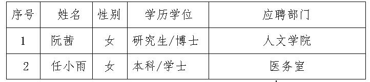 根據(jù)陜西省人社廳《關(guān)于陜西省事業(yè)單位公開招聘人員辦法》規(guī)定及《商洛學(xué)院2020年人才招聘計(jì)劃》,經(jīng)過(guò)資格審查、試講(筆試)、專家面試等環(huán)節(jié)考察,并經(jīng)院長(zhǎng)辦公會(huì)2020年8月19日研究,同意招聘阮茜等2位同志來(lái)我校工作,現(xiàn)予以公示。如有異議,請(qǐng)于2020年8月27日前向人事處或紀(jì)委辦公室反映。