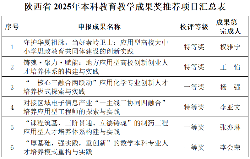根據(jù)《關(guān)于開展2025年高等教育教學(xué)成果獎評審工作的通知》(陜教函〔2025〕688號)文件精神,我校認(rèn)真組織開展高等教育教學(xué)成果獎申報(bào)工作,經(jīng)各教學(xué)單位推薦,校內(nèi)外專家評審,學(xué)校教學(xué)工作委員會審定,擬推薦《聚守護(hù)華夏祖脈,當(dāng)好生態(tài)衛(wèi)士:秦嶺腹地大中小學(xué)思想政治教育一體化建設(shè)的創(chuàng)新實(shí)踐》等6個(gè)項(xiàng)目(見下表)申報(bào)2025年陜西省高等教育教學(xué)成果獎,現(xiàn)予以公示。