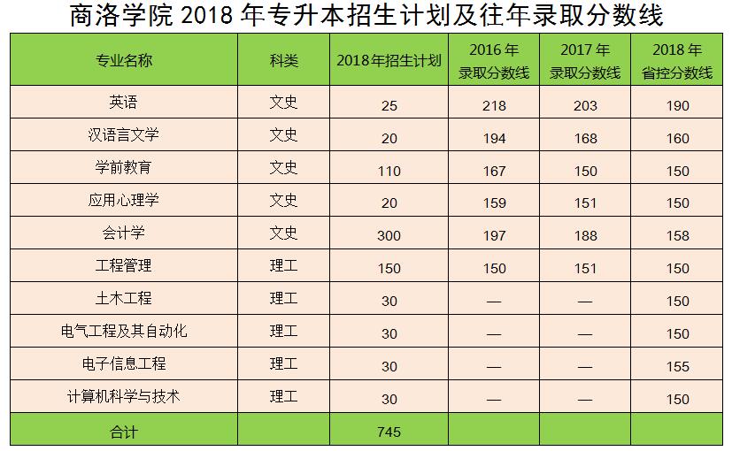 根據(jù)陜教〔2018〕93號(hào)文件精神,陜西省教育廳下達(dá)我校2018年普通高等教育專(zhuān)升本招生計(jì)劃745個(gè),共10個(gè)招生專(zhuān)業(yè),詳細(xì)各專(zhuān)業(yè)招生計(jì)劃及歷年錄取分?jǐn)?shù)線(xiàn)如下。