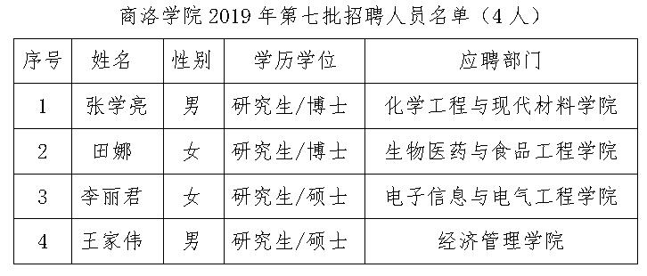 根據(jù)陜西省人社廳《關于陜西省事業(yè)單位公開招聘人員辦法》規(guī)定及《商洛學院2019年人才招聘計劃》,經過資格審查、試講、專家面試等環(huán)節(jié)考察,并經院長辦公會2019年5月14日研究,同意招聘張學亮等4位同志來我校工作,現(xiàn)予以公示。如有異議,請于2019年5月20日前向人事處或監(jiān)察室反映。