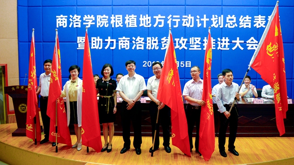 會議總結(jié)了我校根植地方行動計劃三年來取得的成效及經(jīng)驗,表彰了根植地方行動計劃先進(jìn)集體及先進(jìn)個人,頒發(fā)了2019年“趙鵬大院士獎教金”,為6個助力商洛脫貧攻堅人才服務(wù)團(tuán)授旗。會上,我校與商洛高新區(qū)(商丹園區(qū))管委會簽訂了《合作共建商洛高新區(qū)創(chuàng)新創(chuàng)業(yè)示范園協(xié)議書》,與陜西森弗天然制品有限公司簽訂了《共建商洛學(xué)院-森弗健康學(xué)院協(xié)議》。