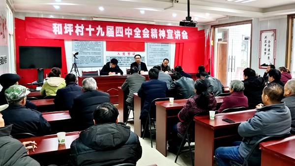 11月29日,校黨委書記龍治剛赴我校包扶村——鎮(zhèn)安縣回龍鎮(zhèn)和坪村宣講黨的十九屆四中全會精神,并指導(dǎo)脫貧攻堅工作。該村“四支隊伍”、黨員代表、群眾代表共計40余人聆聽了宣講。副校長王新軍、黨委辦公室·院長辦公室主任張向東一同參加了宣講活動。