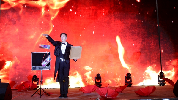 現(xiàn)場氣氛熱烈、座無虛席,晚會在熱情歡快的民樂合奏《龍騰虎躍》中拉開了帷幕。16個節(jié)目以歌曲、魔術(shù)、舞蹈、小品、朗誦、武術(shù)、器樂演奏等形式依次呈現(xiàn),內(nèi)容豐富、精彩紛呈。其中,活力健身操《瀟灑小姐》動感十足、青春洋溢,展現(xiàn)了商院學(xué)子朝氣蓬勃、自信向上的精神風(fēng)貌;小品《青年黨員有作為》講述了大學(xué)生黨員響應(yīng)國家號召,主動回歸基層,助力鄉(xiāng)村振興的動人故事;歌曲《我們的時光》帶我們翻過青山,感受海風(fēng)拂過椰樹的溫柔;漢服舞蹈《紙扇書生》以翩若仙鶴的舞步展現(xiàn)出書生的瀟灑風(fēng)姿;朗誦《晨光夕憶》聲情并茂,憶往昔革命初心,暢想火紅的中國夢;舞蹈《排舞》活力四射,將現(xiàn)場氣氛推向高潮。
