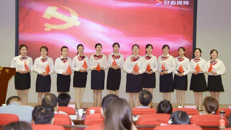 表彰大會(huì)上,圖書館館員們集體表演了紅色詩歌朗誦《黨旗飄飄》,學(xué)生代表誦讀了紅色經(jīng)典《可愛的中國(guó)》。他們用最溫暖的文字、最動(dòng)情的聲音、最深情的語句,歌頌偉大的中國(guó)共產(chǎn)黨,歌頌偉大的祖國(guó),表達(dá)了為共產(chǎn)主義事業(yè)奮斗終身的堅(jiān)定決心。