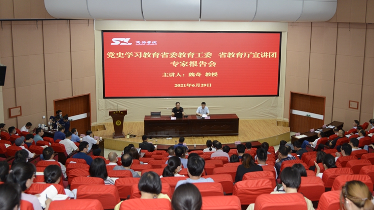 為進一步推動我校黨史學習教育扎實有序開展,營造“學黨史、悟思想、辦實事、開新局”的濃厚氛圍,6月29日,我校邀請陜西省委教育工委、省教育廳黨史學習教育宣講團成員、西北政法大學馬克思主義學院院長魏奇教授來校,為師生作了題為《從黨史學習中汲取民族復興的力量》的宣講。省委黨史學習教育第十三巡回指導組組長、商洛市人大常委會一級巡視員劉淑慧,全體校領導、處級以上黨員干部、思政課教師及師生代表400余人聽取了報告。