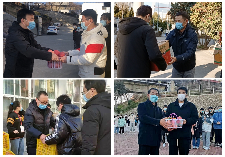 今年,受新冠疫情影響,全體學(xué)生在學(xué)校度過(guò)元旦佳節(jié),為使同學(xué)們度過(guò)一個(gè)溫馨、和諧、快樂(lè)的元旦,學(xué)校為全體學(xué)生精心準(zhǔn)備了新年禮物。1月1日,校領(lǐng)導(dǎo)張志昌、范新會(huì)、彭虎軍、劉勇、劉寶盈、王新軍分別深入北新街校區(qū)和丹江校區(qū),為全體學(xué)生送去蘋(píng)果、橘子等新年禮物,祝福同學(xué)們?cè)谛碌囊荒昶桨布椤W(xué)業(yè)有成,取得更大成績(jī)。