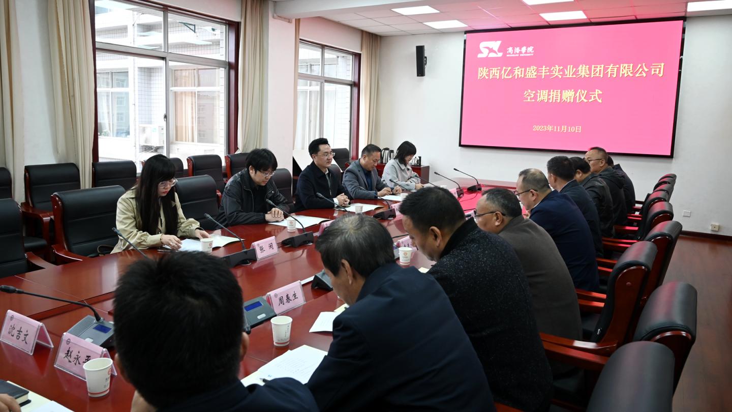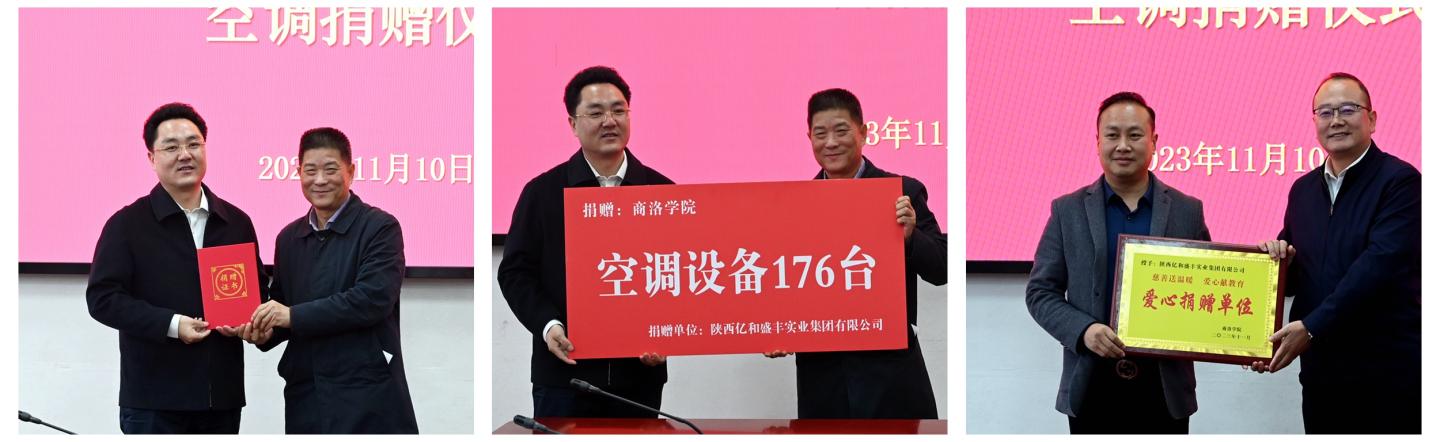 為進(jìn)一步改善學(xué)校辦學(xué)條件,經(jīng)友好協(xié)商,陜西億和盛豐實(shí)業(yè)集團(tuán)有限公司向我校丹江校區(qū)學(xué)生公寓樓C棟捐贈(zèng)價(jià)值60余萬(wàn)元的176臺(tái)空調(diào)設(shè)備。11月10日,我校舉辦空調(diào)設(shè)備捐贈(zèng)儀式。陜西億和盛豐實(shí)業(yè)集團(tuán)有限公司董事局主席黃鵬、董事長(zhǎng)黃濤出席捐贈(zèng)儀式。校長(zhǎng)范新會(huì)代表學(xué)校接受捐贈(zèng)并向陜西億和盛豐實(shí)業(yè)集團(tuán)有限公司頒發(fā)捐贈(zèng)證書(shū)。副校長(zhǎng)郭瑾主持捐贈(zèng)儀式并向企業(yè)頒發(fā)捐贈(zèng)牌匾。