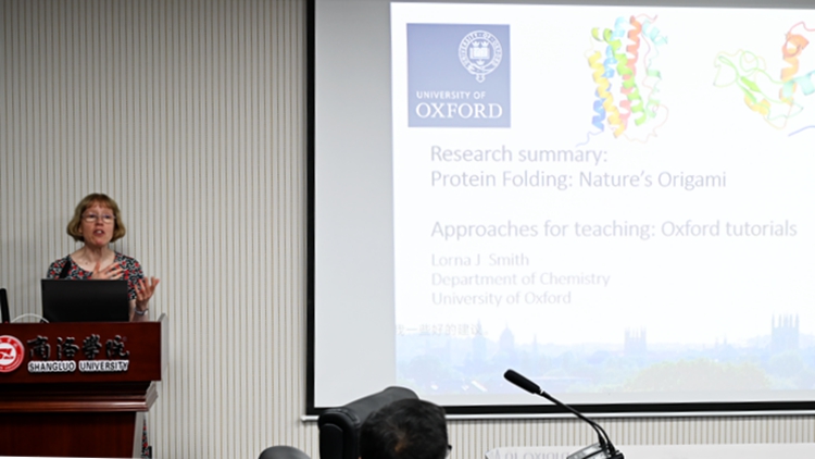 7月25日下午,牛津大學(xué)化學(xué)系教授Lorna J Smith應(yīng)邀來校交流訪問并為我校師生作題為《蛋白質(zhì)折疊:大自然的折紙藝術(shù)》的學(xué)術(shù)報(bào)告。校黨委委員、科技處處長程敏,國際合作與交流處處長張建芳,化材學(xué)院、生物學(xué)院和健康管理學(xué)院相關(guān)負(fù)責(zé)人以及相關(guān)專業(yè)師生代表參加報(bào)告會。