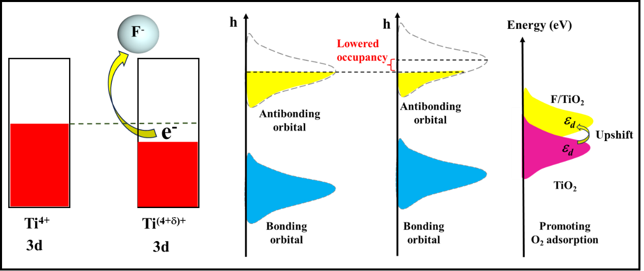 該研究指出,金屬的d帶能級高低決定了催化劑表面活性位點(diǎn)對小分子物質(zhì)的吸附強(qiáng)度,能級越高,催化劑對小分子物質(zhì)的吸附能力越強(qiáng)。該研究通過F摻雜提升TiO2的d帶中心,提高了TiO2對O2的吸附性能,從而增強(qiáng)了TiO2光催化產(chǎn)H2O2的活性。