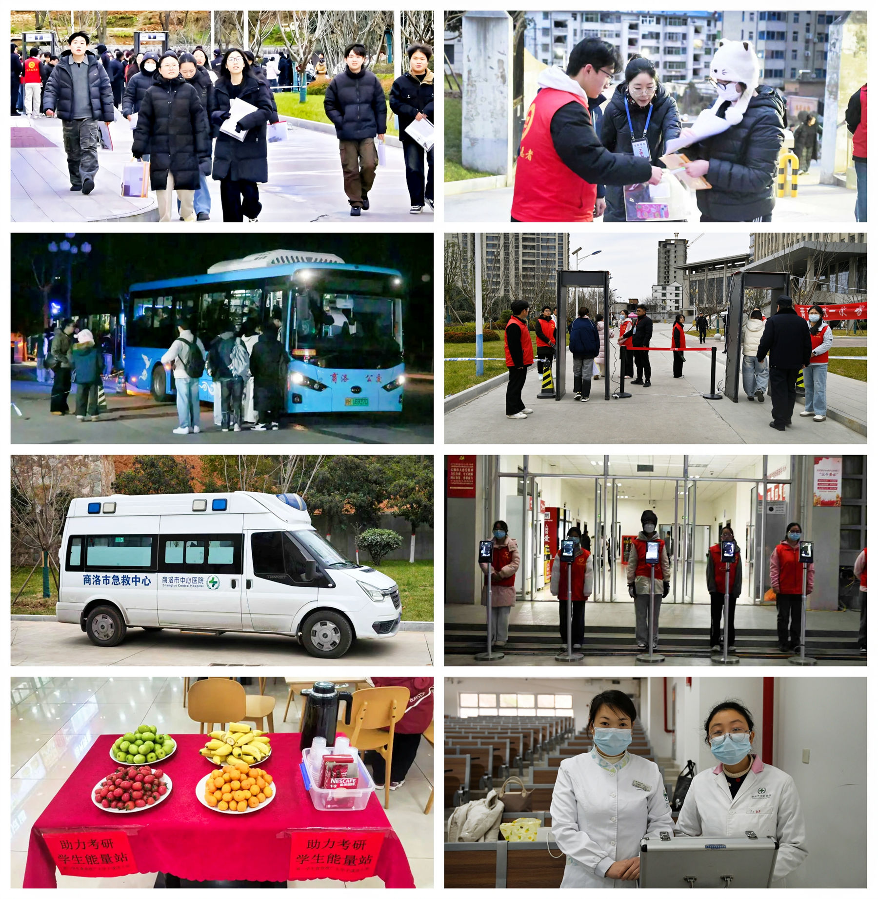 考試期間,各部門協(xié)同聯(lián)動(dòng),為考生營(yíng)造安心、溫暖的考試環(huán)境??键c(diǎn)外設(shè)置物品存放處、醫(yī)療應(yīng)急點(diǎn)、熱水供應(yīng)站及考生休息區(qū),并提前通過(guò)學(xué)校官網(wǎng)發(fā)布考場(chǎng)指引、安檢須知、天氣交通等溫馨提示。電力、無(wú)線電、公安、衛(wèi)健等保障單位派駐人員全程值守,共同護(hù)航考試平穩(wěn)運(yùn)行。