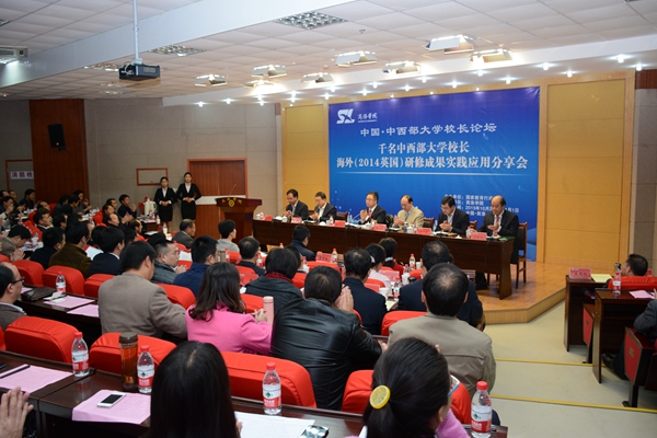 10月31日,由國家教育行政學(xué)院主辦、我校承辦的“中國?中西部大學(xué)校長論壇——千名中西部大學(xué)校長海外(2014英國)研修成果實踐應(yīng)用分享會”在我校召開。來自全國20余所中西部大學(xué)的40余位書記、校長、專家齊聚我校,共同探討交流應(yīng)用型本科院校建設(shè)等有關(guān)問題。教育部港澳臺辦常務(wù)副主任趙靈山、國家教育行政學(xué)院涉外培訓(xùn)部主任樊平軍、陜西省委高教工委常務(wù)副書記董小龍,商洛市委常委、副市長武文罡出席會議并講話。校黨委書記、校長劉建林在開幕式上作了致辭。論壇開幕式由湖南科技學(xué)院黨委書記陳弘主持。