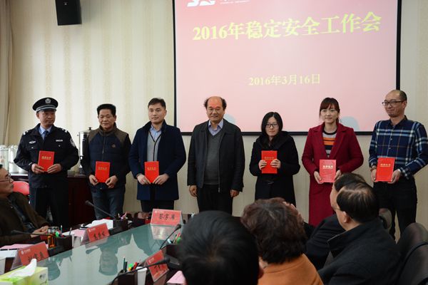 黨委副書記彭虎軍與各二級單位負(fù)責(zé)人簽訂穩(wěn)定安全責(zé)任書。彭虎軍總結(jié)了2015年穩(wěn)定安全工作,從“加強意識形態(tài)領(lǐng)域穩(wěn)定安全工作;強化隱患排查,消除各類安全隱患;進一步強化機制建設(shè),完善安全穩(wěn)定工作運行機制;進一步強化安全教育,提升安全防范能力;進一步強化人防物防技防建設(shè);進一步規(guī)范日常管理;加快推進‘平安校園建設(shè)’”等方面對2016年穩(wěn)定安全和創(chuàng)建“平安校園”工作做了安排部署。