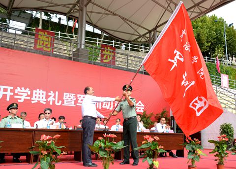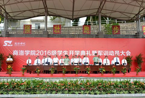 9月5日,天穹碧藍(lán),艷陽(yáng)高照,我校在體育場(chǎng)隆重舉行2016級(jí)學(xué)生開(kāi)學(xué)典禮暨軍訓(xùn)動(dòng)員大會(huì)。商洛市委常委、市人民政府副市長(zhǎng)王華,校領(lǐng)導(dǎo)劉建林、范新會(huì)、魏書(shū)堂、劉寶盈,陸軍第47集團(tuán)軍某部政治部副主任張文平中校,陸軍第47集團(tuán)軍某部機(jī)步營(yíng)營(yíng)長(zhǎng)、商洛學(xué)院2016級(jí)學(xué)生軍訓(xùn)團(tuán)團(tuán)長(zhǎng)馬防少校,商洛市人民政府辦公室紀(jì)檢組長(zhǎng)郭安貴出席大會(huì)。校黨委書(shū)記、校長(zhǎng)劉建林作重要講話,并向承訓(xùn)教官授予2016級(jí)學(xué)生軍訓(xùn)團(tuán)團(tuán)旗。大會(huì)由校黨委副書(shū)記彭虎軍主持。各學(xué)院(部)黨、政主要負(fù)責(zé)人,學(xué)生處、教務(wù)處、招生就業(yè)處、宣傳部、校團(tuán)委、圖書(shū)館主要負(fù)責(zé)人及2016級(jí)新生參加了大會(huì)。