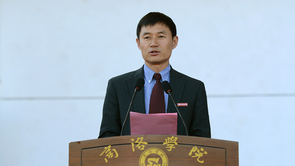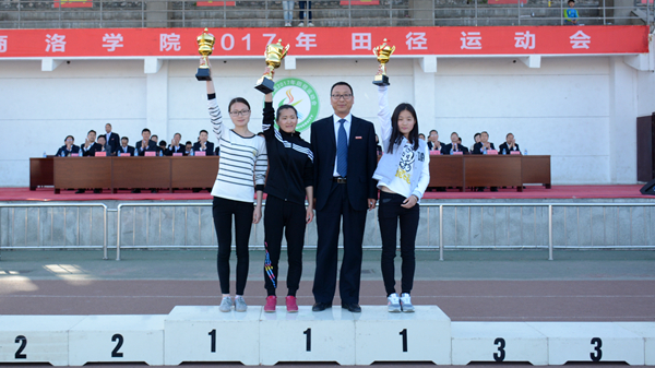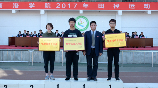 在熱烈的掌聲中,校長范新會、副校長魏書堂、黨委副書記彭虎軍、副校長劉寶盈分別為體育道德風尚獎、團體總分前三名、男子總分前三名和女子總分前三名獲獎集體代表頒獎。