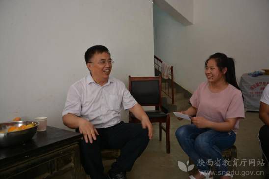 陜西省政府學(xué)位委員會(huì)秘書(shū)長(zhǎng)袁寧與建檔立卡貧困戶學(xué)生張永慧交談并送上慰問(wèn)金