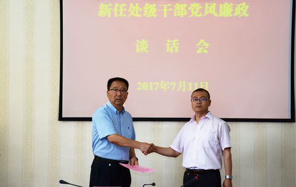 廉政談話會(huì)上,新任處級(jí)干部簽訂了《廉潔從政承諾書》并逐一遞交到龍治剛手中。
