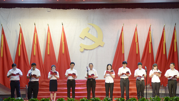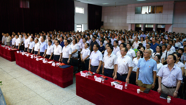 會場氣氛隆重?zé)崃?,黨旗鮮艷高揚(yáng),黨徽熠熠閃光,師生精神飽滿。大會伊始,全體起立,高唱國歌。激昂的旋律、洪亮的歌聲響徹會場。
