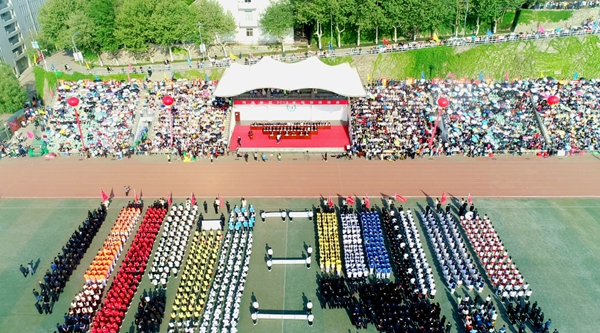 文體表演尾聲,全場師生揮舞著手中小紅旗,共同唱響《我和我的祖國》,齊聲高喊“祖國,我愛你”,把現(xiàn)場氣氛推向高潮。