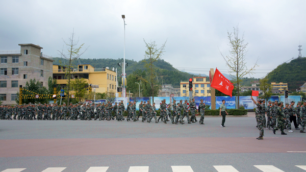 上午8時整,全體參訓(xùn)新生按照10個連編制在學(xué)校體育場整齊列隊, 隨后,在各連旗手的引領(lǐng)下,同學(xué)們意氣風(fēng)發(fā),邁著堅定有力的步伐,向目的地進發(fā)。走出北新街校區(qū)大門后,軍訓(xùn)拉練隊伍沿街東進,到G40高速引線轉(zhuǎn)而向南,跨過丹江大橋,沿比亞迪大道前行,9點半左右,拉練隊伍到達目的地我校丹江校區(qū),原地稍作休息,然后原路返回,拉練總行程約11公里。