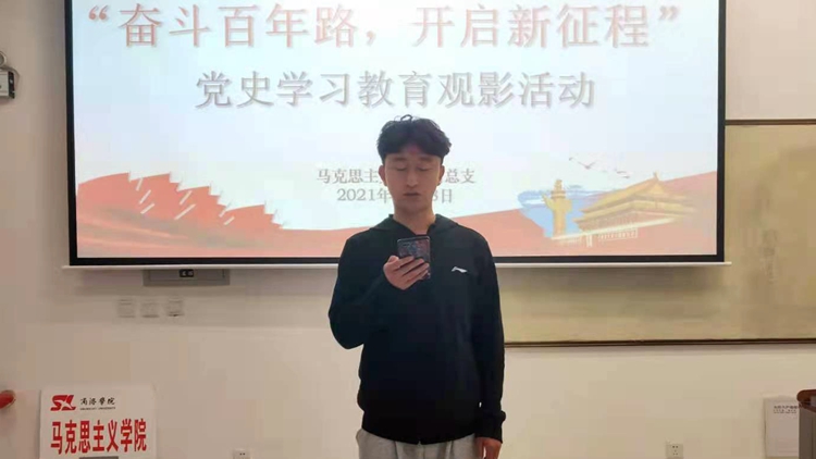 ——組織黨史學習教育觀影活動。4月18日晚,馬克思主義學院在8號教學樓多媒體27教室開展“奮斗百年路,開啟新征程”黨史學習教育觀影活動,2019級和2020級全體同學一起觀看了影片《建黨偉業(yè)》。觀影活動結(jié)束后,同學們紛紛表示,先輩們心中裝著國家,將自己的命運與國家前途命運聯(lián)系在一起,將愛國救亡的擔子挑在肩上,正是有了這些革命先輩的努力,才有了我們今天的美好生活。身處和平年代的我們要珍惜好,守護好這份來之不易的美好生活,要積極踐行黨的宗旨,擁護黨的領(lǐng)導,為建設(shè)更加富強、民主、文明、和諧、美麗的社會主義現(xiàn)代化強國而不懈奮斗。