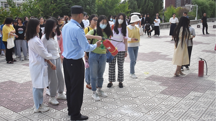 報告結束后,參會師生集體來到二號樓北側平臺,由保衛(wèi)處治安科科長張柯講解演示了滅火器的相關知識及使用方法,并現場指導師生正確使用滅火器。