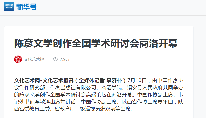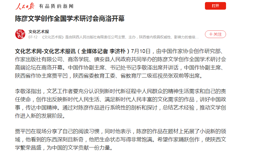 7月10日,由我校與中國(guó)作家協(xié)會(huì)創(chuàng)作研究部、作家出版社有限公司、鎮(zhèn)安縣人民政府聯(lián)合舉辦的陳彥文學(xué)創(chuàng)作全國(guó)學(xué)術(shù)研討會(huì)高端論壇在我校舉行。賈平凹、陳彥兩位著名商洛籍作家、茅盾文學(xué)獎(jiǎng)獲得者及50余位國(guó)內(nèi)文學(xué)界專(zhuān)家、學(xué)者齊聚我校開(kāi)展研討交流。人民號(hào)、新華號(hào)、學(xué)習(xí)強(qiáng)國(guó)、華商網(wǎng)、搜狐網(wǎng)、新浪網(wǎng)、中華網(wǎng)、騰訊網(wǎng)、今日頭條、西部網(wǎng)、中國(guó)作家網(wǎng)、西安晚報(bào)、文化藝術(shù)報(bào)、陜西作家網(wǎng)、西安新聞網(wǎng)、商洛新聞網(wǎng)等中央、省、市媒體對(duì)我校陳彥文學(xué)創(chuàng)作全國(guó)學(xué)術(shù)研討會(huì)高端論壇紛紛進(jìn)行了報(bào)道。各類(lèi)微信、微博等自媒體也紛紛報(bào)道和轉(zhuǎn)發(fā),使讀者進(jìn)一步了解了陳彥的文學(xué)世界,陳彥的文學(xué)藝術(shù)也將在更廣闊的空間傳播,積極促進(jìn)了商洛乃至陜西文學(xué)事業(yè)的繁榮發(fā)展,擴(kuò)大了我校的知名度和影響力。