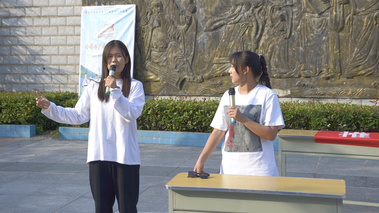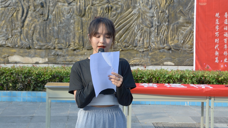人文學(xué)院學(xué)生代表王瀅在表態(tài)發(fā)言中呼吁全體學(xué)生要規(guī)范使用普通話,讓規(guī)范語言之花開遍美麗的校園。學(xué)生朱怡寧、丁欣玉為大家表演了相聲《普通話》,通過生動(dòng)有趣的表演向展示了不良語言習(xí)慣及普通話的別樣韻味,切實(shí)增強(qiáng)了大家的語言規(guī)范意識(shí)。王林等學(xué)生向大家朗誦了紅色詩歌《永遠(yuǎn)跟黨走》,帶領(lǐng)大家重溫了先輩們浴血奮戰(zhàn)的革命歲月,讓大家在詩歌中感悟黨的崢嶸歲月,體會(huì)語言的動(dòng)人魅力。