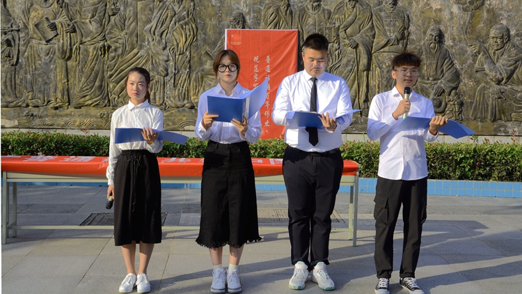 現(xiàn)場師生在推廣橫幅上進(jìn)行簽字,表達(dá)了學(xué)習(xí)國家通用語言文字的決心。