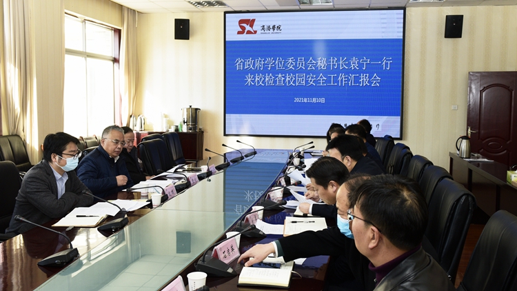 根據(jù)陜西省委教育工委、省教育廳校園安全專項(xiàng)整頓工作安排,11月10日上午,陜西省政府學(xué)位委員會(huì)秘書長(zhǎng)袁寧,省教育廳研究生處處長(zhǎng)張和平、干部成鵬一行3人來到我校,開展校園安全專項(xiàng)檢查工作。校長(zhǎng)范新會(huì)主持召開工作匯報(bào)會(huì)。黨委副書記彭虎軍、副校長(zhǎng)王新軍出席匯報(bào)會(huì)并陪同檢查。黨委辦公室·院長(zhǎng)辦公室、宣傳部、人事處、學(xué)生處、教務(wù)處、保衛(wèi)處、資產(chǎn)管理處、后勤保障處、信息化建設(shè)與管理處相關(guān)負(fù)責(zé)人參加會(huì)議。