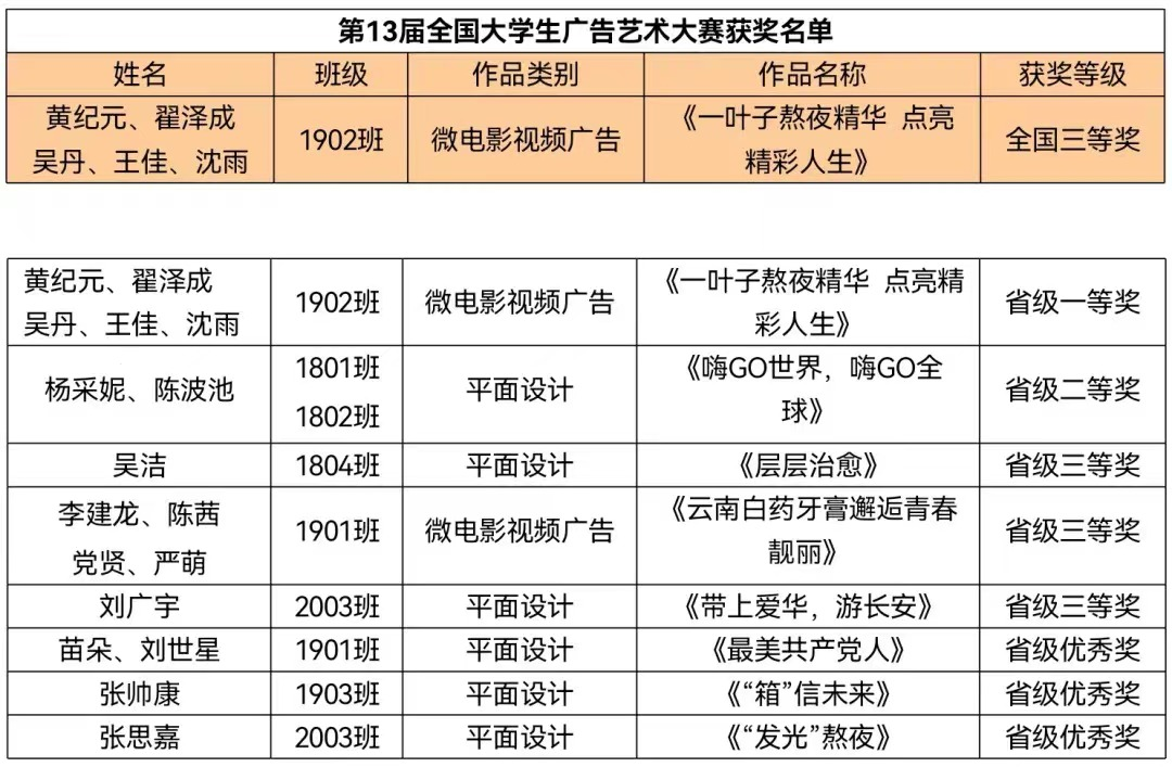 本屆大賽開辟了微電影廣告視頻類新賽道,由藝術(shù)學(xué)院教師楊靜指導(dǎo)的微電影廣告視頻類作品《一葉子熬夜精華點(diǎn)亮精彩人生》獲得國家級三等獎和省級一等獎、《云南白藥牙膏邂逅青春靚麗》獲得省級三等獎;在平面設(shè)計(jì)類賽道中,藝術(shù)學(xué)院教師王曦茜指導(dǎo)的《嗨GO世界,嗨GO全球》獲得省級二等獎,教師王子瑋指導(dǎo)的《層層治愈》榮獲省級三等獎,教師楊靜指導(dǎo)的《帶上愛華游長安》榮獲省級三等獎、《最美共產(chǎn)黨人》獲得省級優(yōu)秀獎,教師張中義指導(dǎo)的《“發(fā)光”熬夜》、教師余鑫指導(dǎo)的《“箱”信未來》獲得省級優(yōu)秀獎。