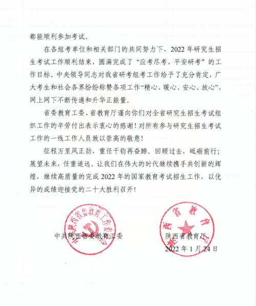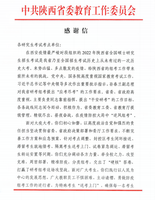 感謝信說,2022年研究生招生考試是我省乃至全國招生考試歷史上從未有過的一次歷史大考,來勢兇猛,多點(diǎn)散發(fā)的疫情給陜西省的組考工作帶來前所未有的挑戰(zhàn),面對大疫大考,我校初心如磐,以高度的政治自覺和強(qiáng)烈的責(zé)任擔(dān)當(dāng)堅(jiān)決貫徹省委、省政府決策部署和委廳工作要求,舉全校之力,攻堅(jiān)克難,周密部署,精準(zhǔn)防疫,分類組考,交出了“硬核”答卷,打贏了考研組考這場攻堅(jiān)戰(zhàn),圓滿完成了“應(yīng)考盡考,平安考研”的工作目標(biāo)。廣大考生和社會各界稱贊各項(xiàng)工作“精心、暖心、安心、放心”,網(wǎng)上網(wǎng)下不斷傳遞升華正能量。