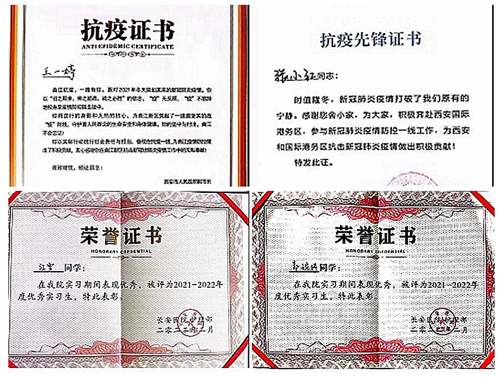 近日,西安曲江新區(qū)和國際港務(wù)區(qū)對抗擊新冠肺炎疫情工作中表現(xiàn)突出的工作人員和志愿者進(jìn)行了表彰。我校王一婷、張小紅、郭江艷、崔晉維、高靜、郭婉婷6名實(shí)習(xí)生榮獲西安曲江新區(qū)和國際港務(wù)區(qū)頒發(fā)的抗疫證書和抗疫先鋒證書。學(xué)生江雪榮獲西安國際港務(wù)區(qū)頒發(fā)的抗疫先鋒證書。張小紅、郭婉婷及江雪3名實(shí)習(xí)生被長安醫(yī)院評為“優(yōu)秀實(shí)習(xí)生”。