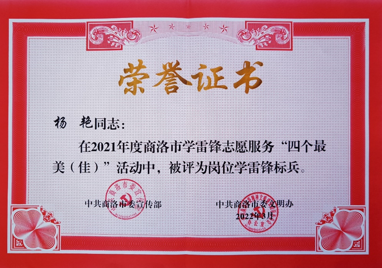 近日,商洛市委宣傳部和商洛市委文明辦公布了商洛市2021年度學(xué)雷鋒志愿服務(wù)“四個(gè)最美(佳)”活動(dòng)先進(jìn)典型名單,我校體育教學(xué)研究部教師楊艷榮獲“崗位學(xué)雷鋒標(biāo)兵”榮譽(yù)稱號(hào)。