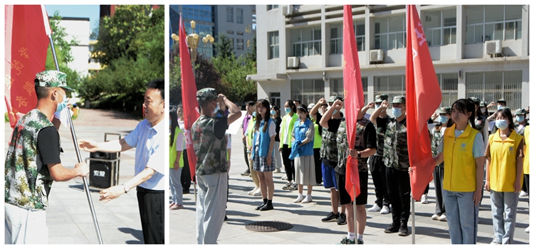 在熱烈的掌聲中,彭虎軍向退役軍人志愿服務(wù)隊(duì)授旗,志愿者代表譚佳豪接旗。